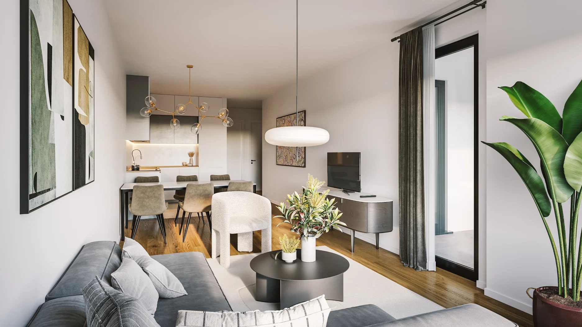Funkcionalan dvoostrano orijentisan trosoban stan sa otvorenim dnevnim boravkom i trpezarijom, kuhinjom sa ostavom, dve spavaće sobe, dva kupatila i terasom, kao i dodatnim prostorima za smeštaj garderobe.